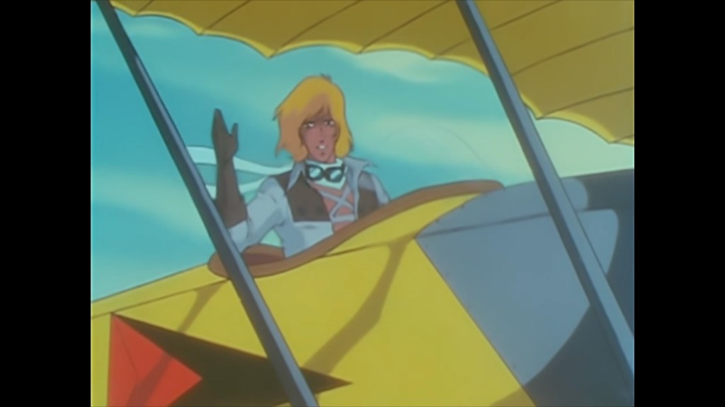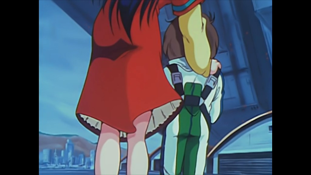 Rick’s fanjet seats only one person. Thus, Minmei sits on Rick’s lap which is an intimacy of convenience as neither party was romantically assertive in pursuing this physical contact. This is an example of Minmei’s innocence and ingénue status. In Episode 9 the Mayor will enter Minmei in the Miss Macross Contest maintaining her innocence.