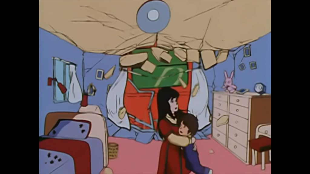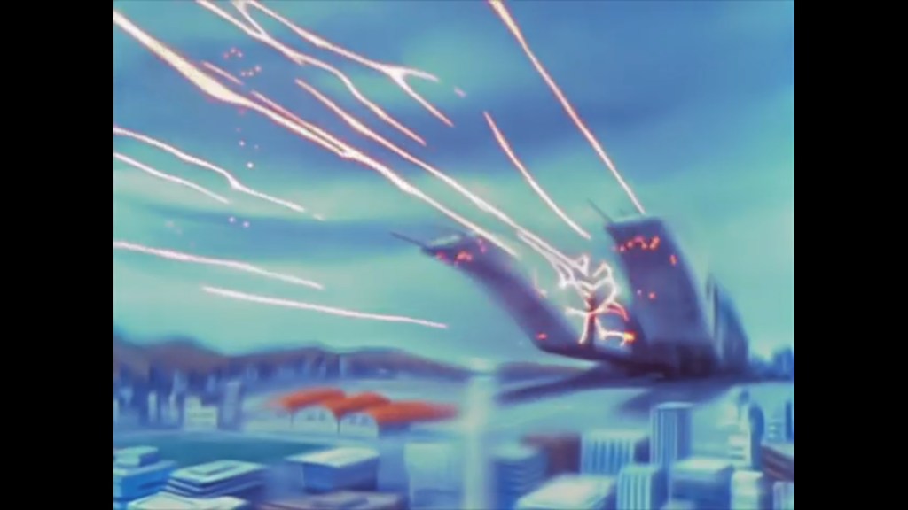 One final visual which provides thematic and aesthetic continuity to the Robotech franchise is the similarity between the arrival of the SDF-1 and the Invid. These events could each be construed as a version of a mushroom cloud stemming from the out-of-universe 1945 nuclear bombing of Japan. See the synopsis for Episode 8 for a further discussion of this topic.