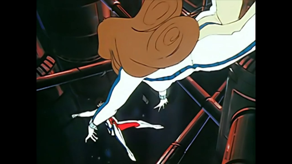 Hikaru (Rick) first meets Minmay (Minmei) in freefall in SDF Macross: Do You Remember Love? (DYRL). In this film they crash inside the engine block at 00:13:00 and their time together resembles the plot of Episode 4. In the SDF Macross television series the audio fades out for the freefall scene in this episode and an ethereal score fades in. This score and lack of dialogue heightens the emotional impact of this scene. In Robotech Minmei screams while a suspenseful score plays in the background. Minmei’s screams in Robotech heighten her characterization in that series but diminish the impact of the overall scene. This scene will be repeated again in Episode 17 during Rick’s hallucinations. In the SDF Macross version of Episode 17 Minmei sings a pop song titled “0-G Love” (Zero-Gravity Love) which equates the weightlessness of love with the weightlessness of freefall. English speakers are so familiar with the phrase “to fall in love” it must be given special scrutiny so as to grasp the international recognition of its accuracy in illuminating this shared aspect common to all humanity. See the synopsis for Episode 25 for a discussion of additional visual portrayals of this concept. See List 8 at the end of this essay for a summary of these instances.