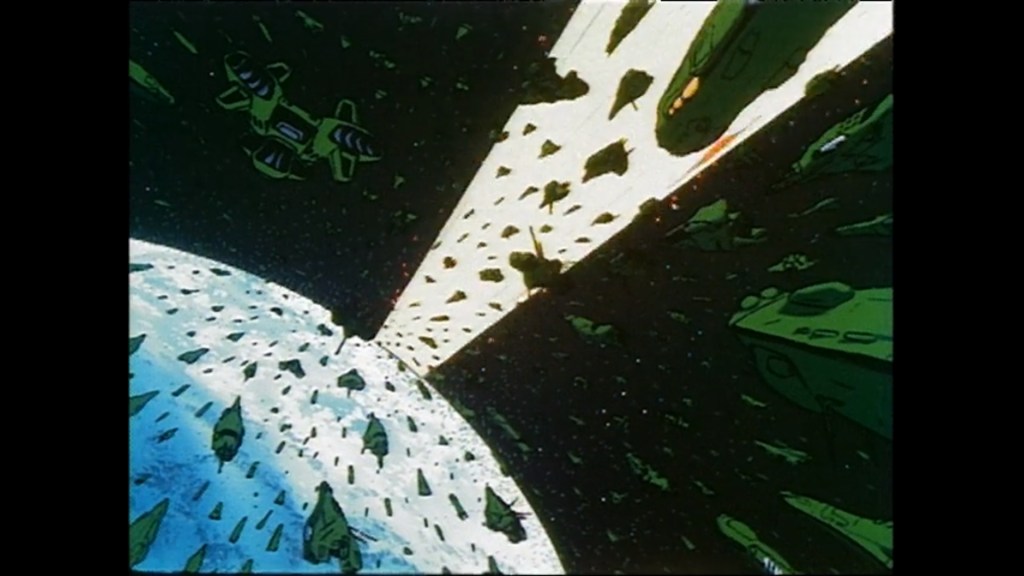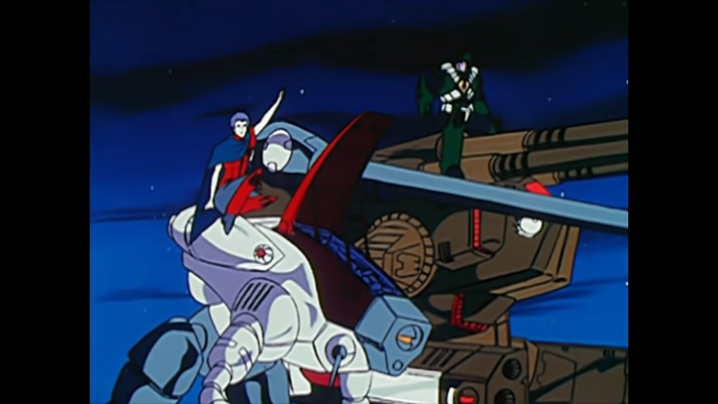 Breetai destroys Armor-3 (ARMD – Armaments Rigged-up Moving Deck) but forbids any attacks on the SDF-1. This supports a symbolic parallel between the SDF-1 and Minmei as Breetai wishes to subdue and capture the SDF-1 undamaged, and Rick wishes to possess and subdue Minmei in order to receive her voluntary reciprocation of his love. As an antagonist Breetai contends with his own plot tension. He possesses superior fire power and the ability to destroy the SDF-1, but his goal is to capture the SDF-1 undamaged. Similarly, Rick contends with his own internal tension as he feels the primitive urge to possess Minmei, but prefers she exercise her free will and choose him as her romantic partner. Breetai’s constraints in seizing the SDF-1 may also be an allegory for Rick’s insecurity and overabundance of politeness in his romantic overtures toward Minmei. Both series eventually reveal Breetai’s motivations for capturing the SDF-1. In SDF Macross it seems the firing of the main gun revealed the presence of a long lost technology known as reflex weaponry. In Robotech Breetai desires to retrieve the protoculture matrix.