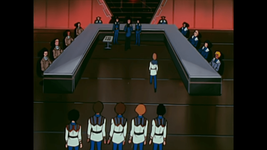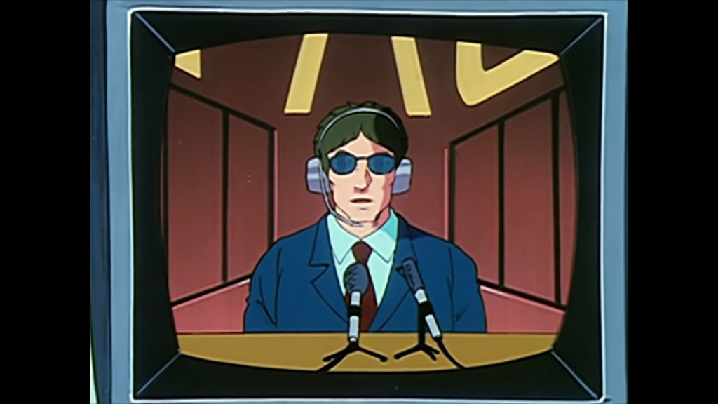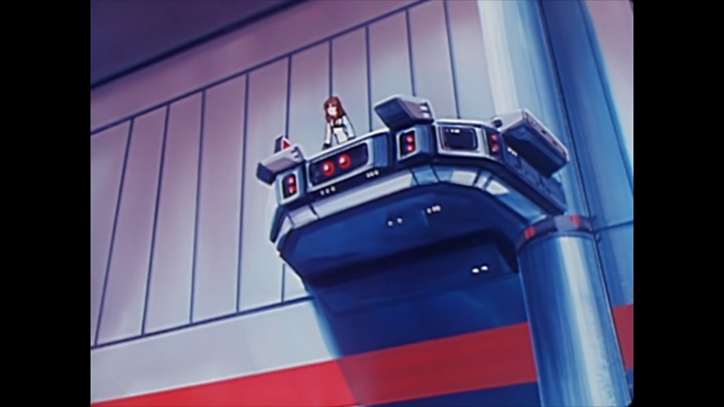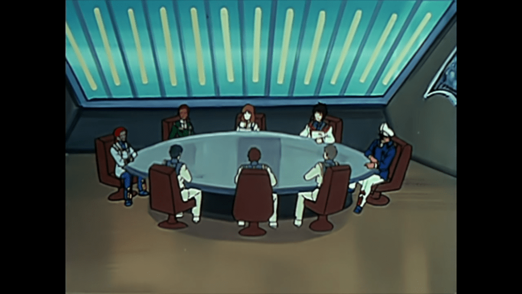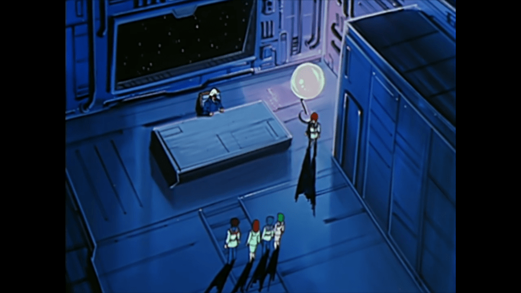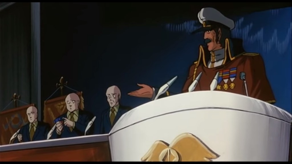 Captain Gloval decides to leave the opening ceremony and take command on the bridge. He is on a raised platform with Senator Alphonso Russo (originally an unnamed politician in SDF Macross but later referred to as Hyman Gwent), and instead of climbing stairs or taking an elevator up to the bridge which would symbolically place him above the Senator and the civilians, he takes an elevator down to the civilian’s level. This may symbolize Captain Gloval’s humanity.