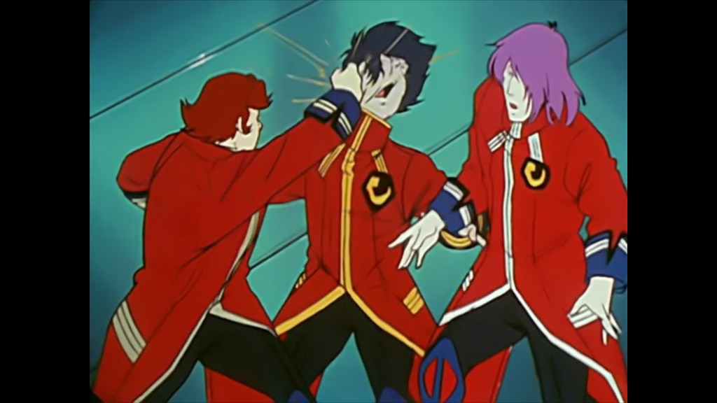 The insignia on the brim of Captain Gloval’s cap matches the design on Roy’s belt buckle. The colors and geometry vaguely resemble the Zentreadi insignia. The symbol from Captain Gloval’s cap and Roy’s belt buckle also share similarities with the design on the brim of the veritech helmets and the Bridge Bunnies’ sailor collars on their naval rigs, sailor suits, or sailor style collars on their sailor fukus. Interestingly, the Robotech Defense Force (UN Spacy) kite symbol, the Captain’s cap, Roy’s belt buckle, and the sailor collars are all symmetrical while the Zentreadi insiginia is asymmetrical. This asymmetry as well as Breetai’s faceplate may indicate a spiritual disfigurement while the symbols of the Earth forces represent balance and harmony.