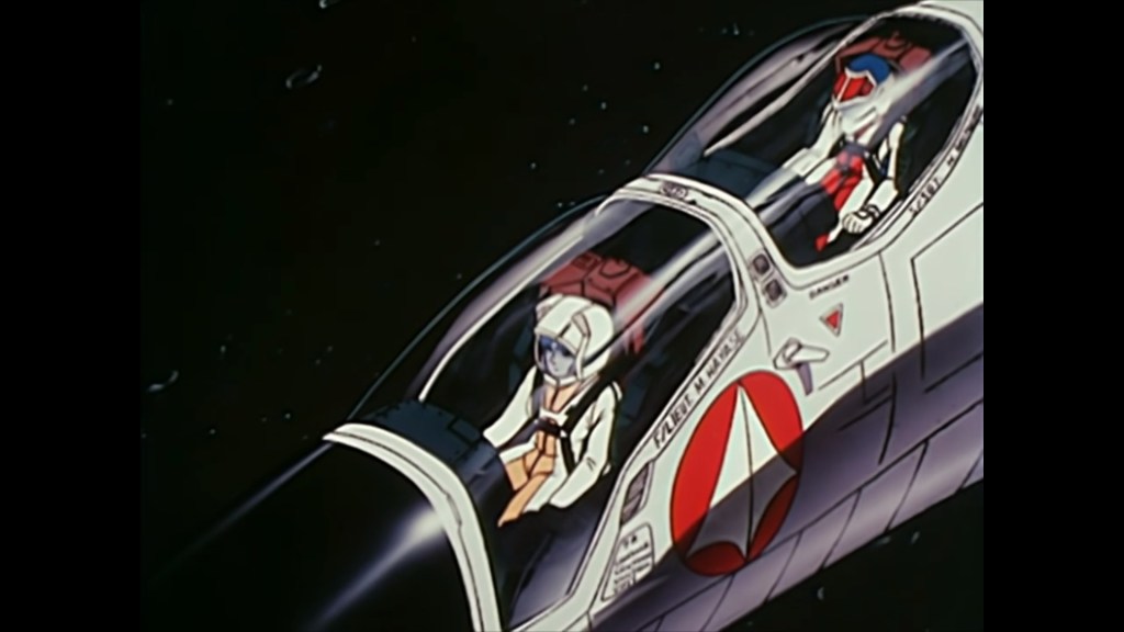 Rick’s fanjet becomes entangled and ensnared upside down inside the SDF-1. This may symbolize Rick becoming entangled in events beyond his control, Rick being trapped inside the SDF-1, Rick’s world being turned upside down, or Rick being caught in Minmei’s romantic web.