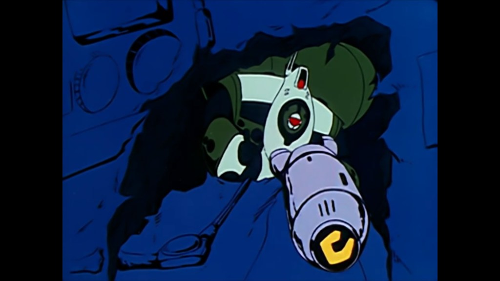 Rick shoots a battlepod in a mild version of the “Beserker trope” which is discussed in the synopsis for Episode 23. His motivation for this action was seeing Minmei unconscious. Rick likely felt angry. However, this action could be viewed as defending or protecting Minmei. This in fact will become Rick’s raison d’etre (reason for existence) as hinted at in Episodes 4, 5, and 17 before finally being stated in Episode 22.