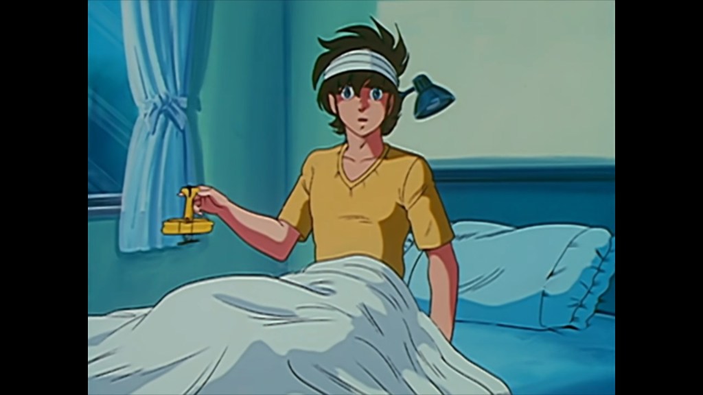Minmei’s freefall in this episode may represent Rick’s concept of an ideal relationship with Minmei. Minmei’s freefall can be examined in a frame by frame analysis. She was in his guardian’s grasp. She falls away. He chases after her. She falls head first with arms swept back for a brief moment. In this pose her body language is simultaneously submissive, passive, directional, and independent which are all conflicting attributes somehow coexisting within Minmei’s character. Rick and Minmei reach out for each other and she moves from frustratingly beyond his grasp to his co-pilot seat. The co-pilot seat may symbolize a romantic relationship and her submissiveness. This brief 20 second freefall sequence may be a visual exposition of the entire arc of Rick and Minmei’s relationship and may foreshadow and encapsulate the narrative engine and core plot of this series. These being Rick’s unrequited love and Minmei’s elusiveness. The freefall depicted in DYRL loses all this nuance as it depicts a much more one-sided rescue. Similar to this 20 second freefall as a summary of this series’ story arc, Rick’s hallucination in Episode 17 will similarly condense the main themes of 36 episodes of material into one single episode. This freefall is another example of an artistic device referred to as mise en abyme, a concept discussed earlier in this synopsis. The freefall can be categorized as a mise en abyme as it is body language which is later repeated emotionally as well as verbally through dialogue. Mise en abyme is similar to a musical reprise and as such the freefall, as first portrayed here in this episode, may strike the first harmonic tone of the core plot. This frequency will build to a crescendo with consecutive resonant tones as the series progresses. Rick’s hallucinations in Episode 17 may be another note struck with matching oscillation as notably the freefall is shown again in this episode. In Robotech the freefall was shown three times over the course of the series if the premiere of Codename: Robotech is included in the count. See the synopsis of Episode 14 for a discussion of Codename: Robotech. These harmonies may build to a vibrating climactic resonance disaster in Episode 36 when Lisa’s character offers salvation through the introduction of a dissonant note to the score of this plot which then resolves in a new harmony. This being Rick and Lisa’s romance. A musical coda may present itself in a VHS tape included in a Matchbox Robotech playset titled Robotech Wars in 1986 as the freefall is shown again in this tape.