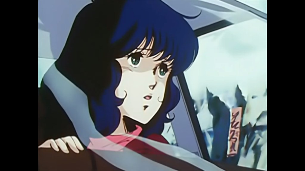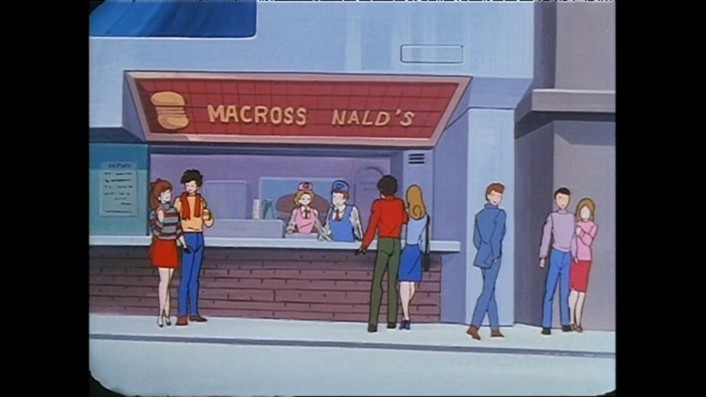 In SDF Macross two pedestrians witness Captain Gloval and Senator Russo drive past. One pedestrian is Mayor Tommy Luan (unnamed Mayor in SDF Macross). They question whether the SDF-1 is capable of flight as well as what will happen to all the businesses which grew up around the alien ship once the SDF-1 goes into service. The doubts about the flight worthiness of the SDF-1 build tension for the audience. The SDF-1 will in fact struggle to launch in the next episode. In the Filmrise subtitles the Mayor’s concern about the local businesses foreshadows their reconstruction inside the SDF-1 in later episodes. None of this dialogue is present in Robotech, and in the ADV (A. D. Vision Films) English language dub of SDF Macross the mayor’s dialogue is altered to state he is simply concerned about the economy of the city. In the AnimEigo subtitles he expresses concern about their business interests. This scene also highlights the attention to detail and above average quality of animation present in this series. This scene portrays a reflection in a car window which would normally not be present in animation.