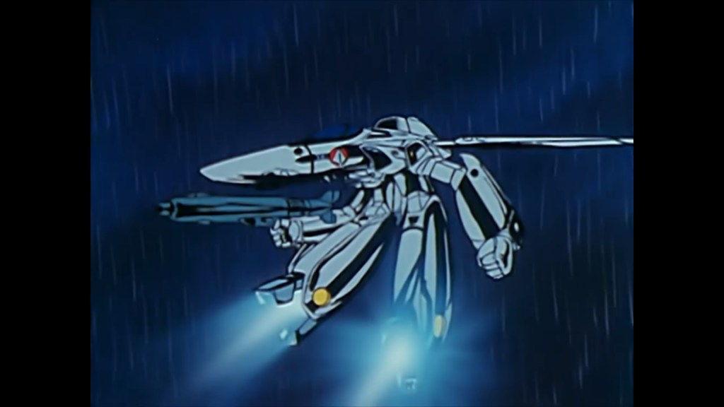 Rick and Roy transform their veritechs into guardian (GERWALK or Ground Effective Reinforcement of Winged Armament with Locomotive Knee-joint) mode. Initial sketches for the series focused on mecha with reverse knee joints. Supposedly the battloid mode was mandatory as it was insisted upon by toy designers. The battloid is anthropomorphic which increases profits. The reverse knee joint is more alien and may be a marketing risk. While the guardian mode of the veritech does utilize the reverse knee joint, the battloid mode is an available option with human-like knees.