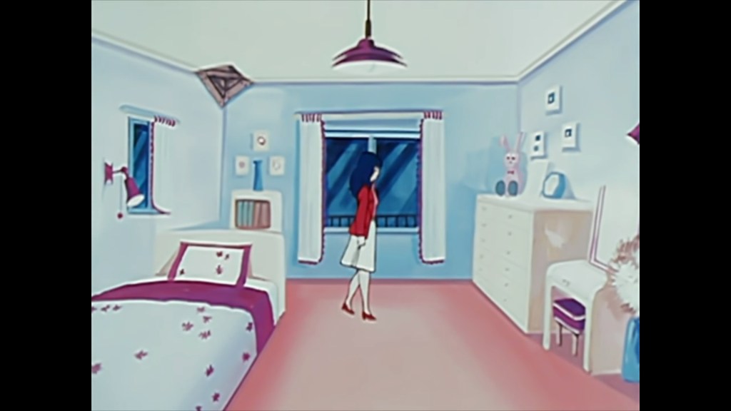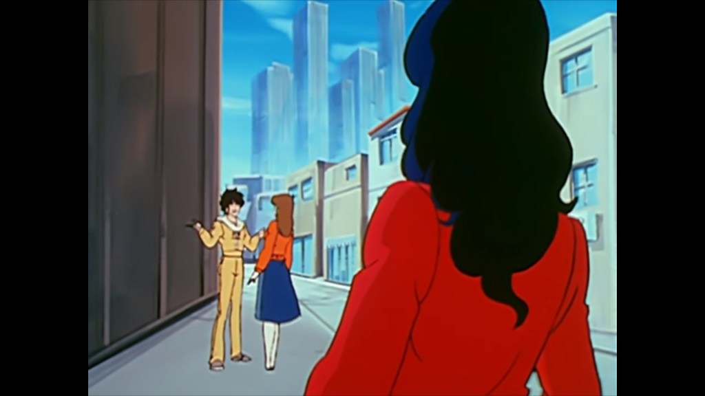 Minmei looks up to Rick from her window. This perspective may be symbolic of Rick as the main character, but later Rick will be on the street level looking up at and idolizing Minmei in Episode 8.
