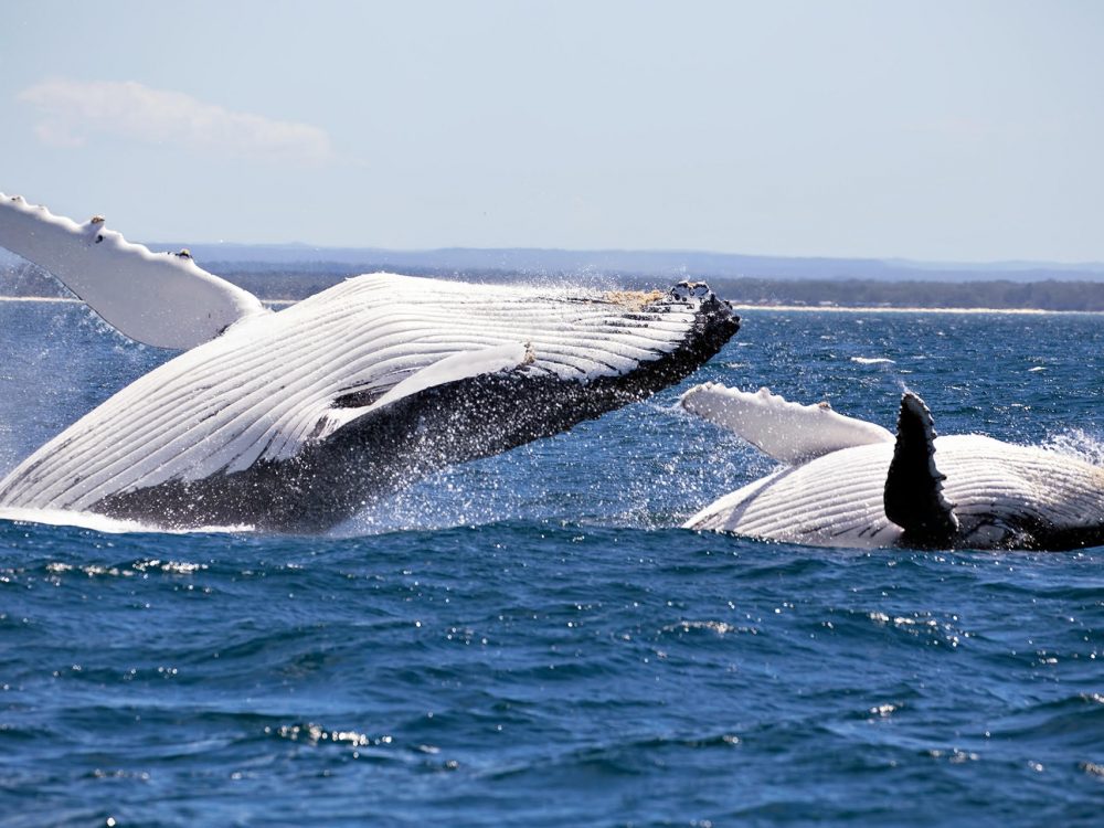 Humpback whales portraying counter shading coloration and ventral grooves.