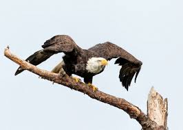 A bald eagle with raised wings and talons