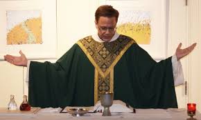 A Catholic priest in his vestment performing the sacrament of Holy Communion.