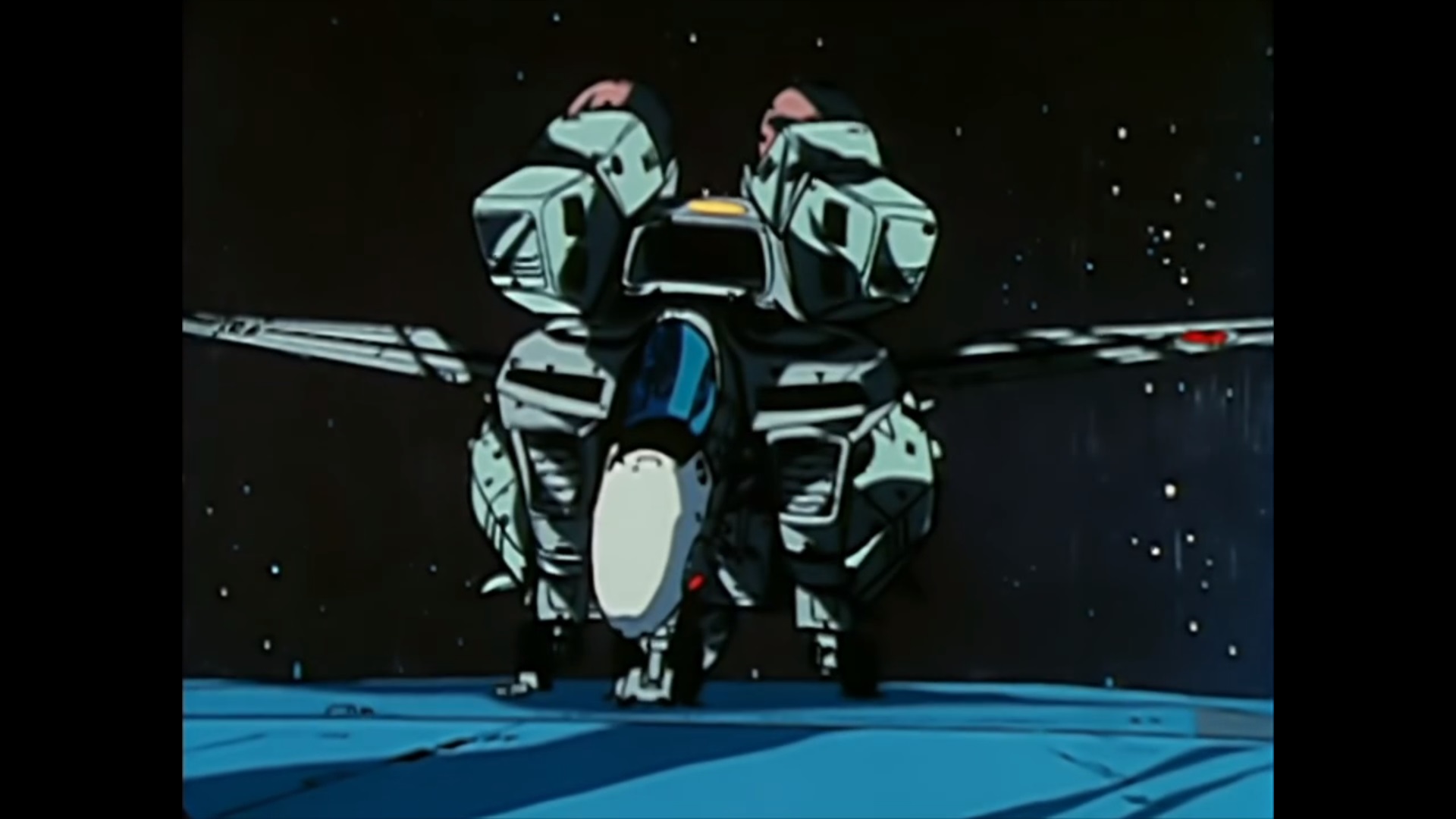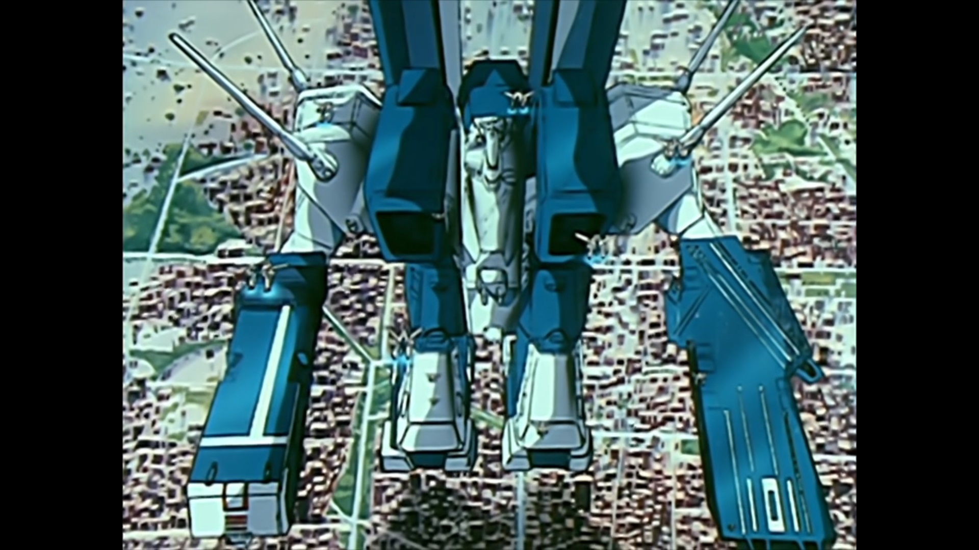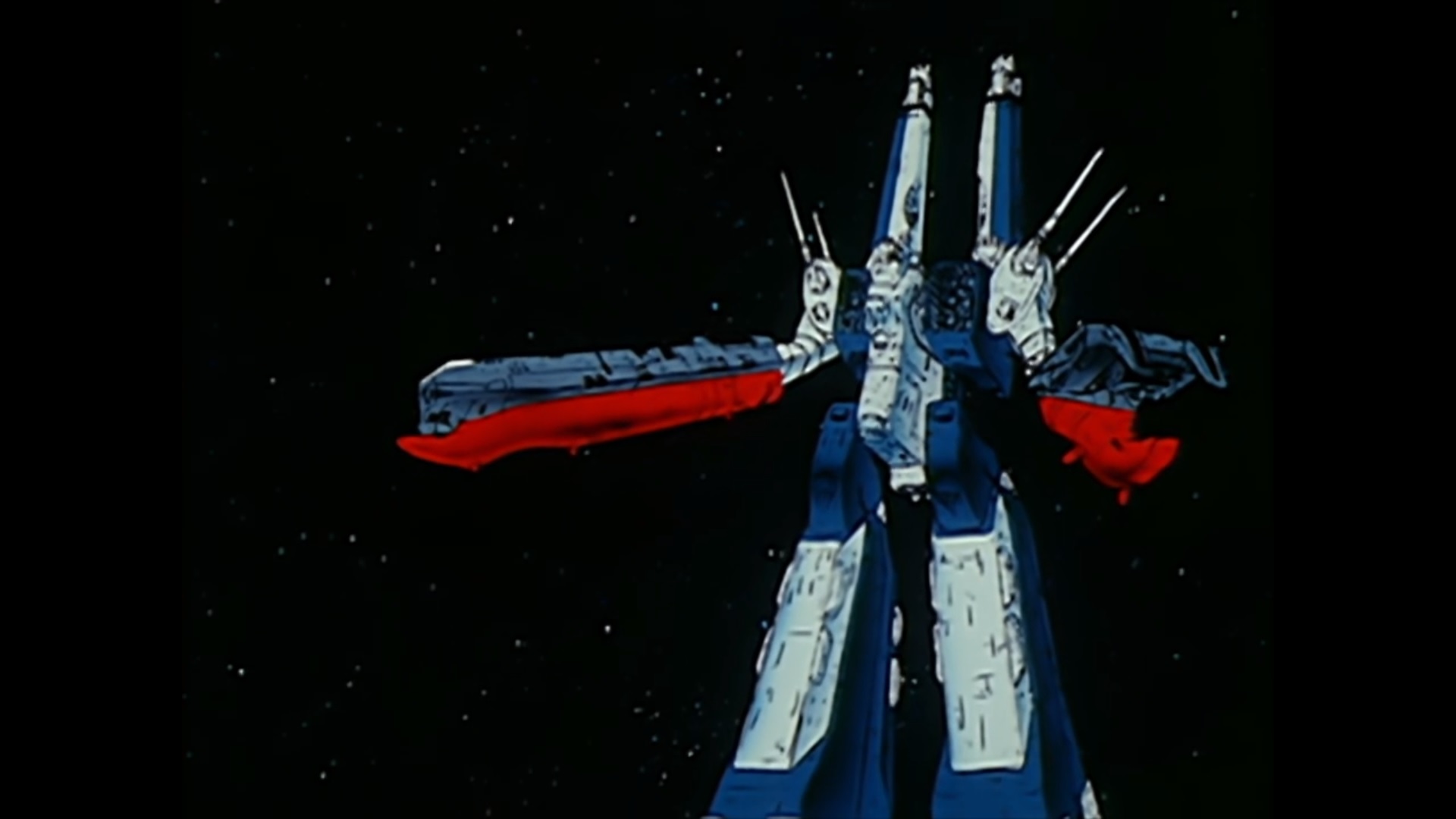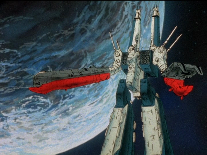 The SDF-1 in battloid mode or attack mode (Storm attacker mode in SDF Macross) with raised main gun booms portraying vertical mecha fins.