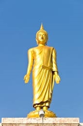 A golden standing Gautama Buddha statue with an ushnisha hairstyle as a supernatural cranial protuberance. Both hands are in the varada mudra or gesture of giving and generosity.