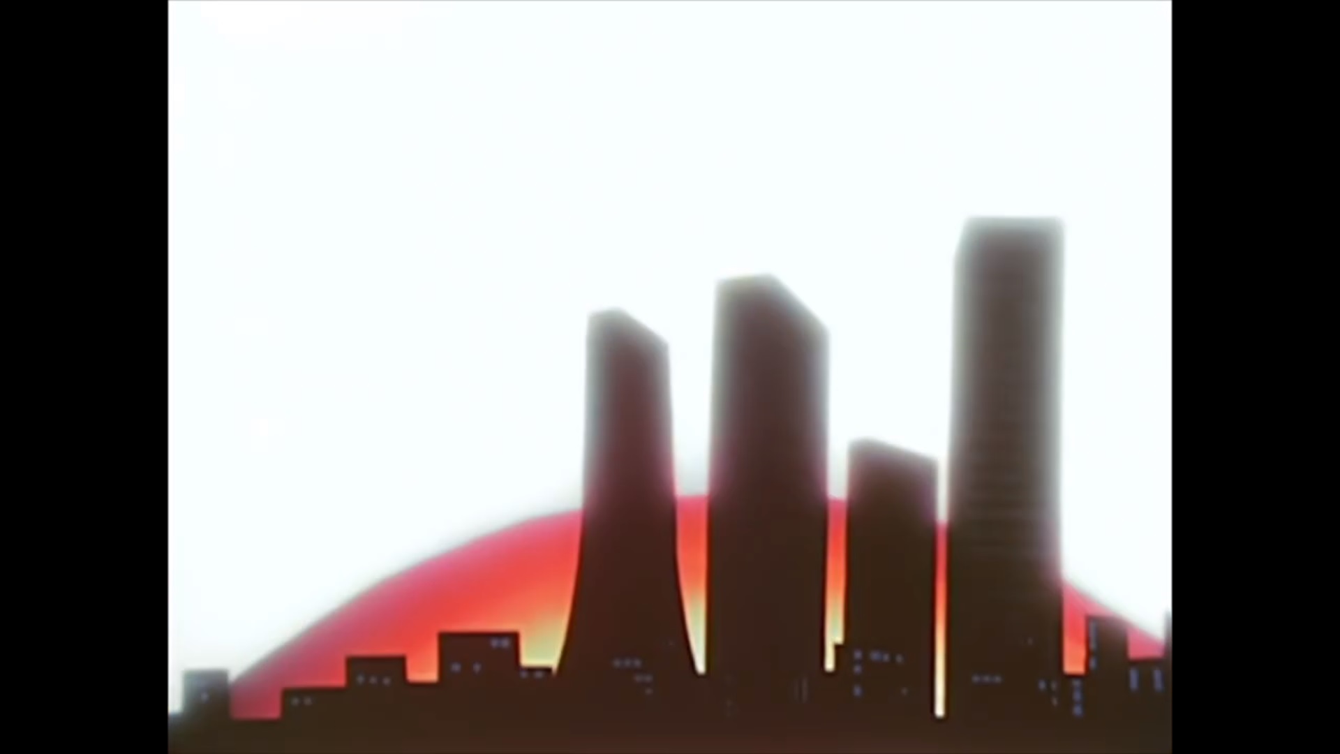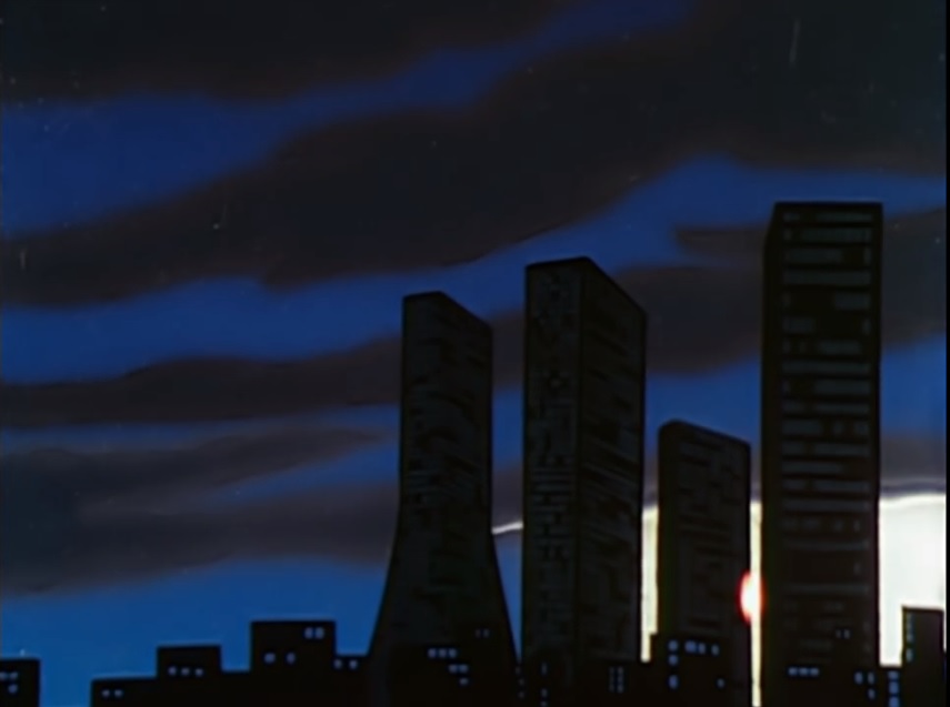 The crash landing of the SDF-1 as seen in Episode 1. The building with the flared base somewhat resembles the Sompo Japan Building.