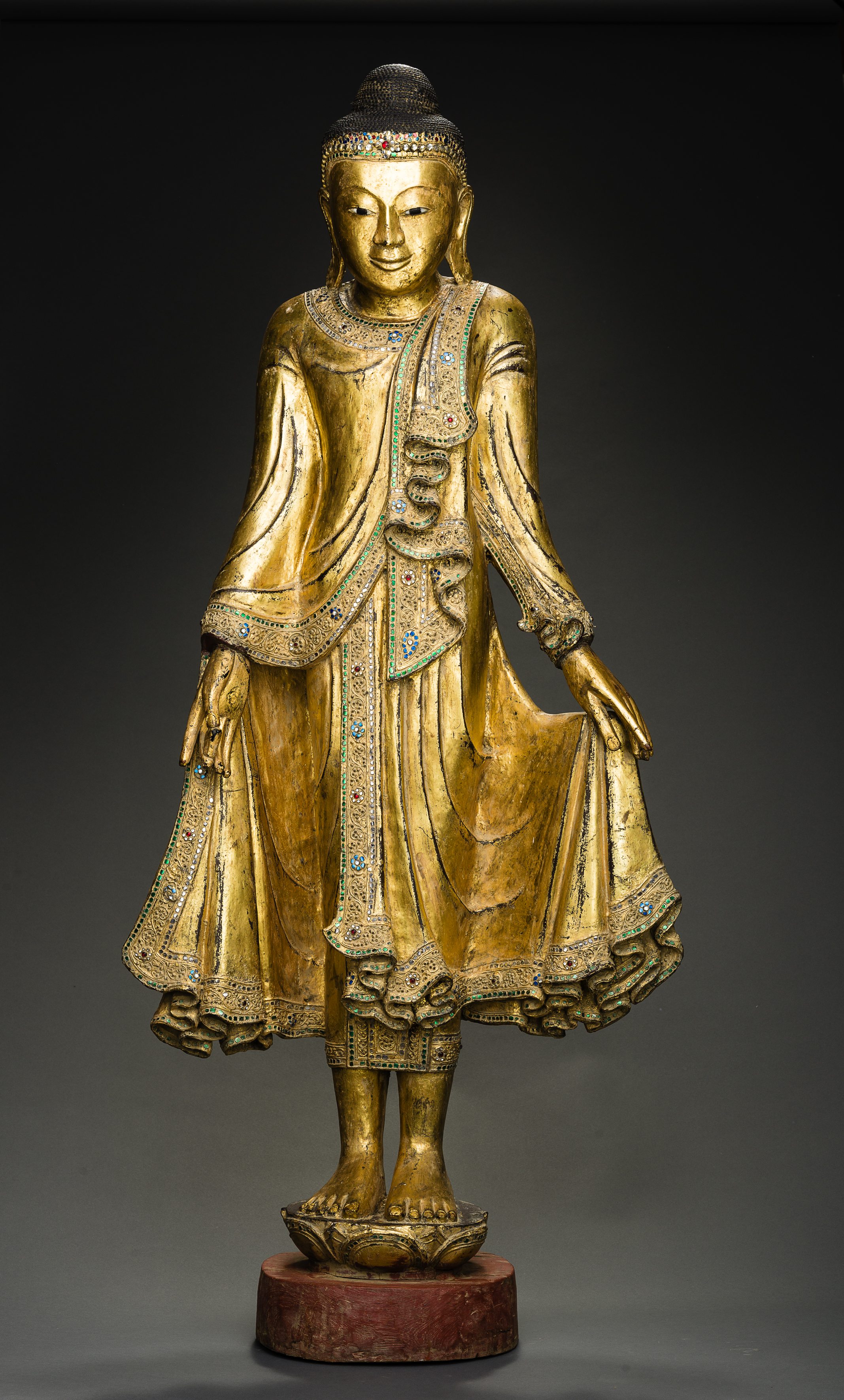 A Mandalay style standing Buddha with his right hand depicting the cincihna mudra or gesture of understanding.
