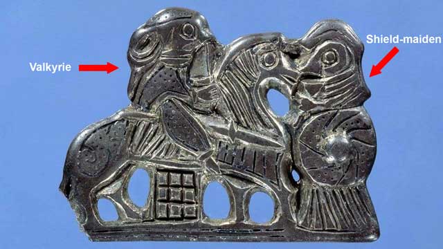 Viking jewelry depicting a woman with a spear on horseback as the earliest portrayal of a Valkyrie dating to the year 850. Valkyrie imagery has evolved from the middle ages to modern portrayals of women on horseback, flying horses, winged horses, or winged women.